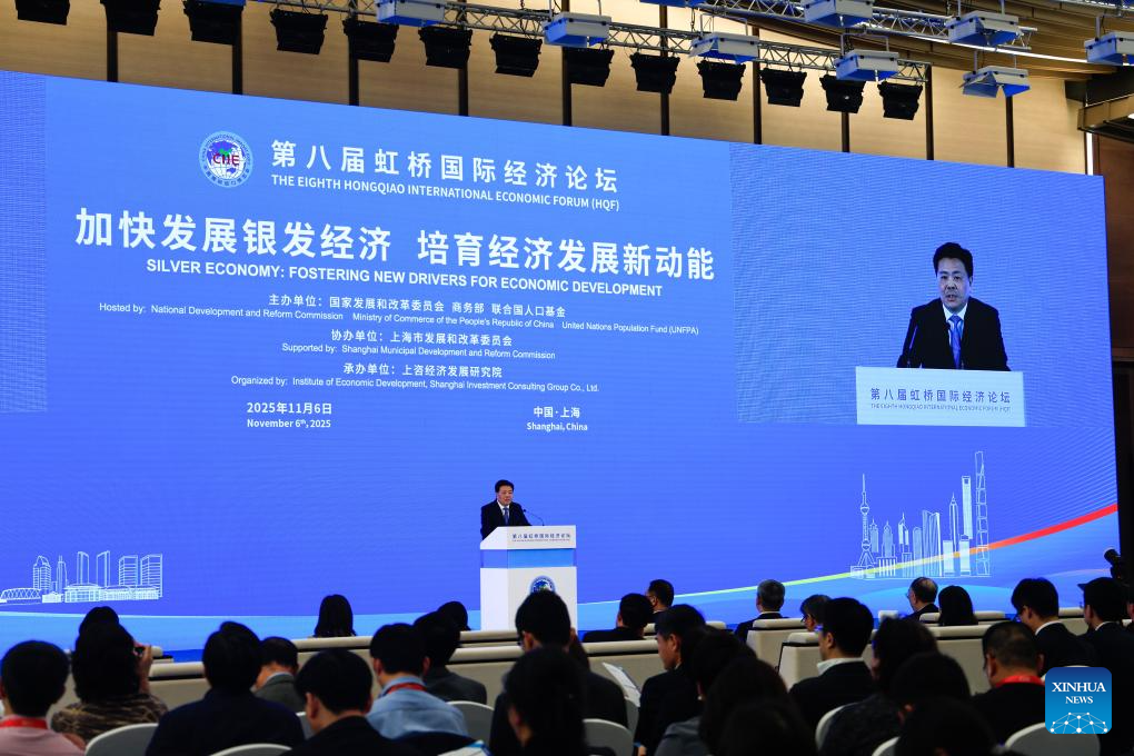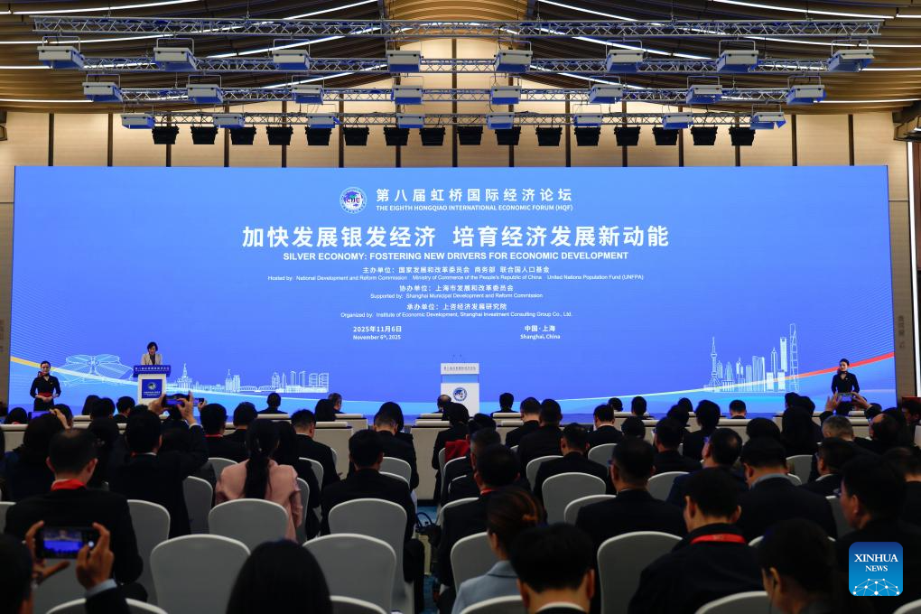 A sub-forum titled "Silver Economy: Fostering New Drivers for Economic Development" is held during the 8th Hongqiao International Economic Forum at the National Exhibition and Convention Center (Shanghai) in Shanghai, east China, Nov. 6, 2025. (Xinhua/Liu Jiaqi)
