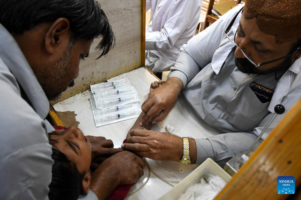 A doctor takes blood sample of a patient at a hospital in southern Pakistan's Hyderabad on Nov. 6, 2025. At least 21 people have died from dengue fever in Pakistan's southern Sindh province so far this year, as health authorities battle a sharp rise in infections across the region, officials said on Thursday. (Str/Xinhua)