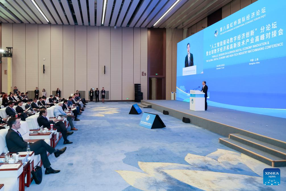 A parallel session on AI-driven digital economy innovation and the Global Digital Economy and High-tech Industry Matchmaking Conference is held on the sidelines of the eighth Hongqiao International Economic Forum at the National Exhibition and Convention Center (Shanghai) in Shanghai, east China, Nov. 5, 2025. (Xinhua/Wang Xiang)