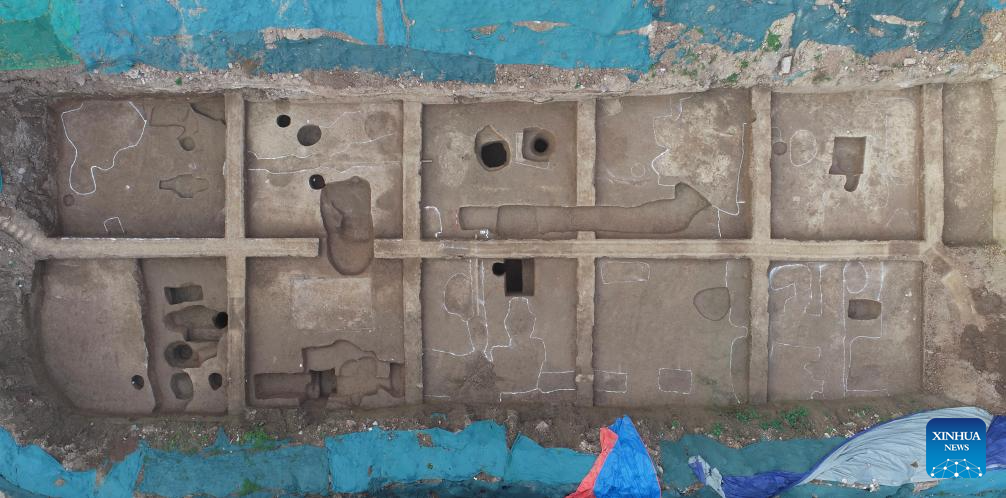 This file drone photo shows the ruins of the Tongyifang, a residential compound for high-ranking officials and dignitaries in the renowned Chang'an City during the Sui (581-618) and Tang (618-907) dynasties in Xi'an, northwest China's Shaanxi Province. Archaeologists have uncovered 25 relic sites in Xi'an, the capital city of northwest China's Shaanxi Province, with finds including ash pits and wells dating back to the Sui and Tang dynasties, the Shaanxi Academy of Archaeology announced on Thursday. (Shaanxi Academy of Archaeology/Handout via Xinhua)