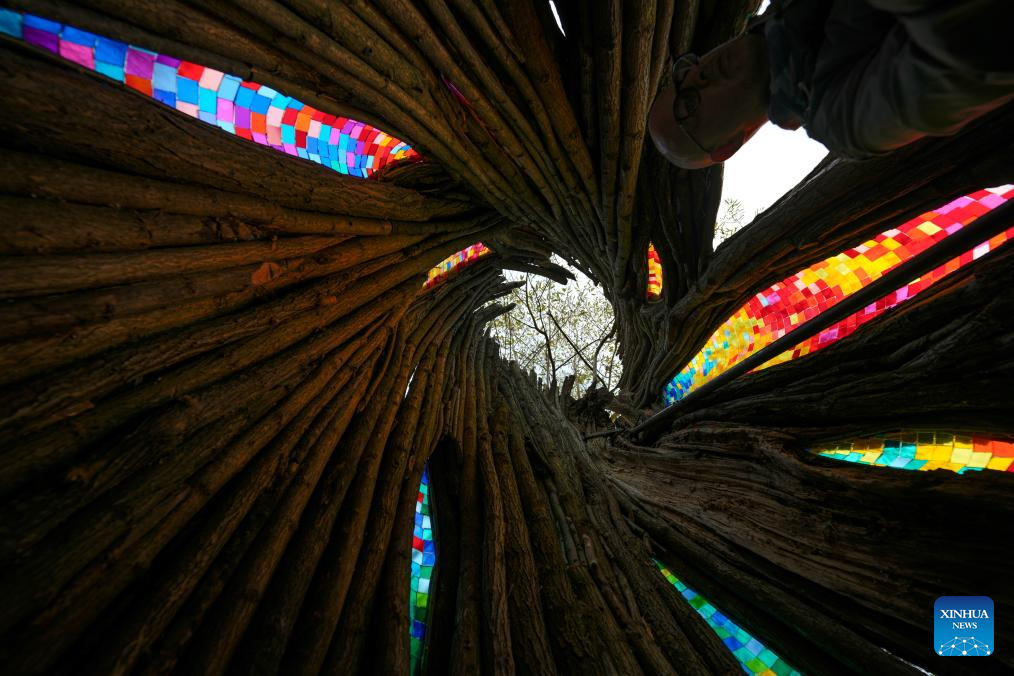 This photo taken on Nov. 5, 2025 shows an interior view of the "Willow Temple" in Warsaw, Poland. The "Willow Temple" is an artistic installation made from a hollow, withered willow tree, transformed with stained glass, metal and wooden elements into a chapel-like space that blends nature and art. (Photo by Jaap Arriens/Xinhua)