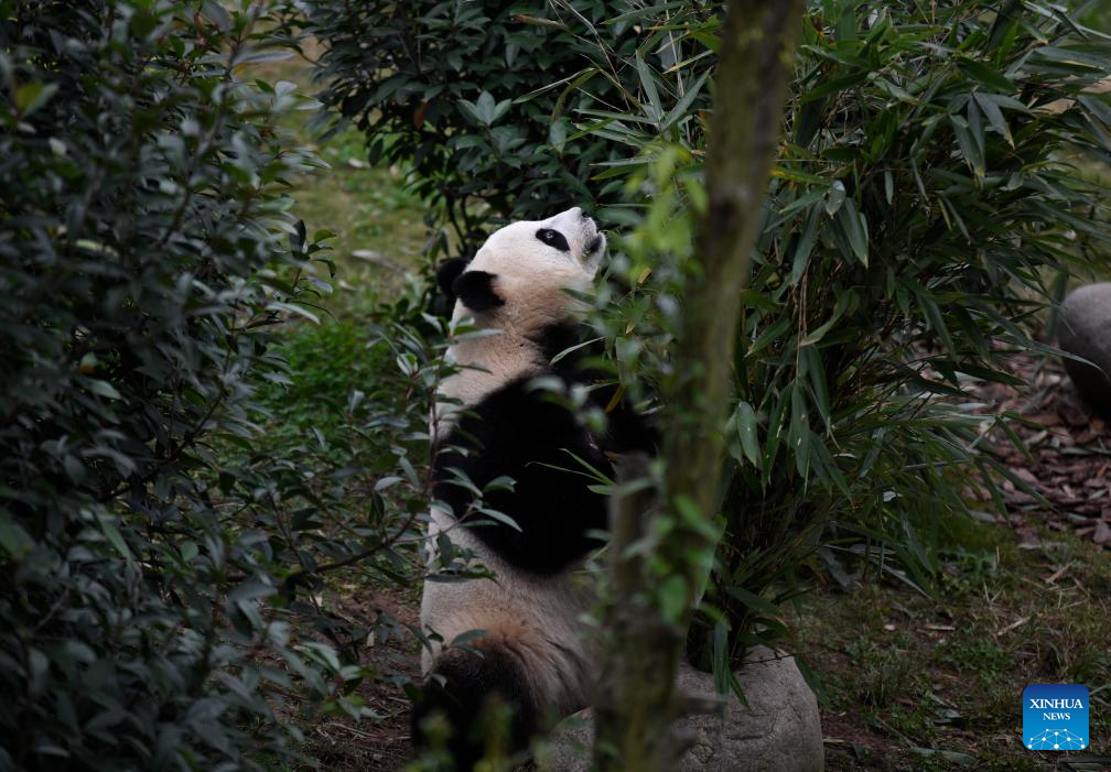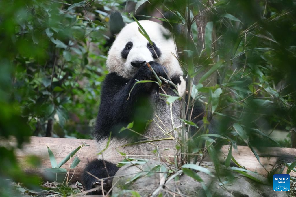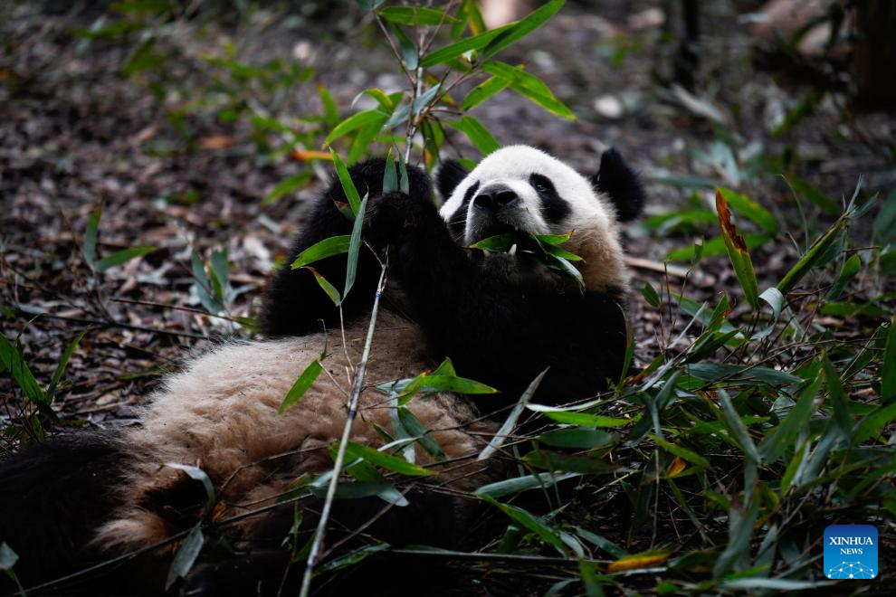 Giant panda "Can Yang" eats bamboos at the Shenshuping giant panda base of Wolong National Nature Reserve in southwest China's Sichuan Province, Nov. 6, 2025. (Xinhua/Xu Bingjie)