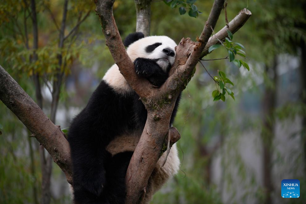 A giant panda rests on a tree at Chengdu Research Base of Giant Panda Breeding in Chengdu, southwest China's Sichuan Province, Oct. 30, 2025. (Xinhua/Bao Feifei)