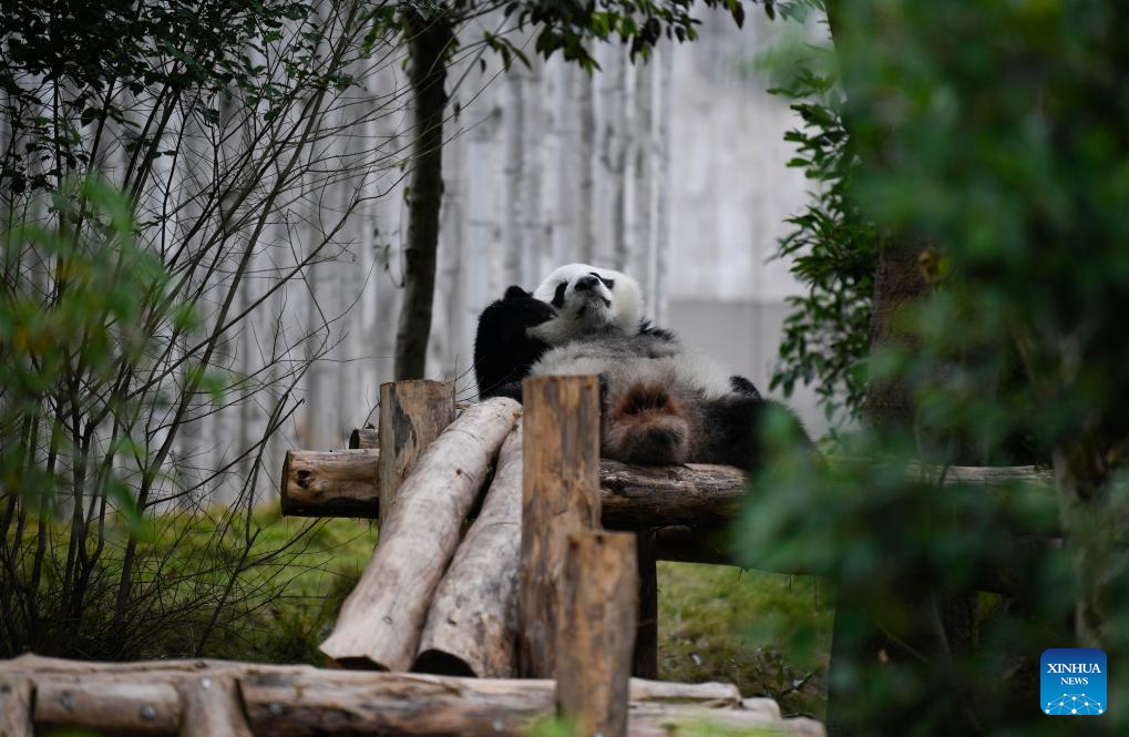Giant panda "Can Yang" (top) frolics with giant panda "Qing Yang" at the Shenshuping giant panda base of Wolong National Nature Reserve in southwest China's Sichuan Province, Nov. 6, 2025. (Xinhua/Xu Bingjie)