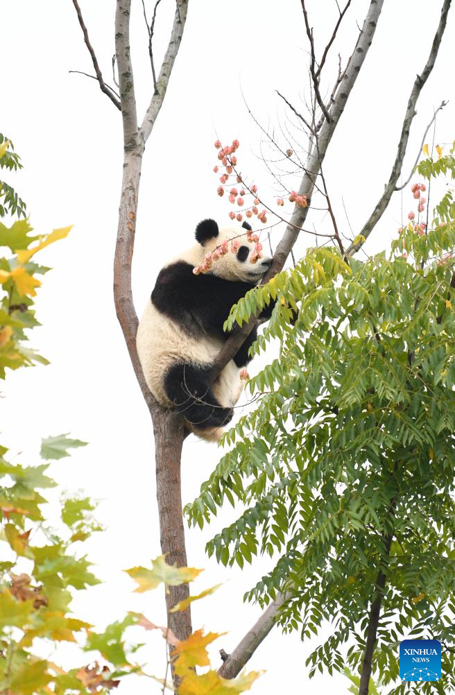 A giant panda plays on a tree at Chengdu Research Base of Giant Panda Breeding in Chengdu, southwest China's Sichuan Province, Oct. 30, 2025. (Xinhua/Bao Feifei)