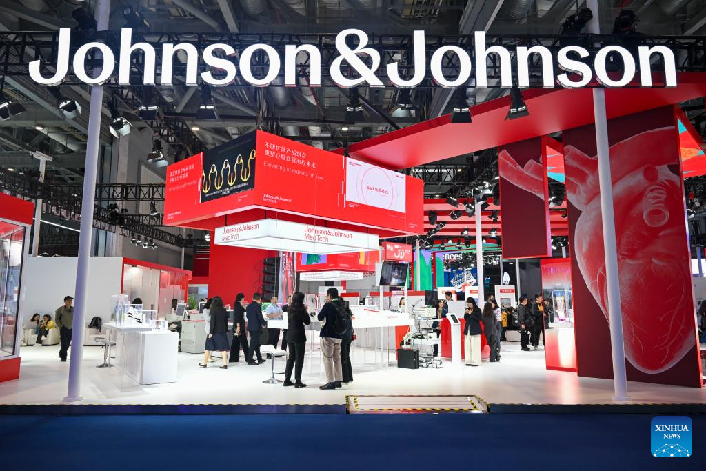 People visit the booth of Johnson & Johnson, an eight-year attendee of the China International Import Expo (CIIE), during the eighth CIIE in east China's Shanghai, Nov. 7, 2025. The eighth CIIE, which opened in Shanghai on Wednesday and will last till Nov. 10, has attracted 4,108 overseas exhibitors from 155 countries, regions and international organizations.