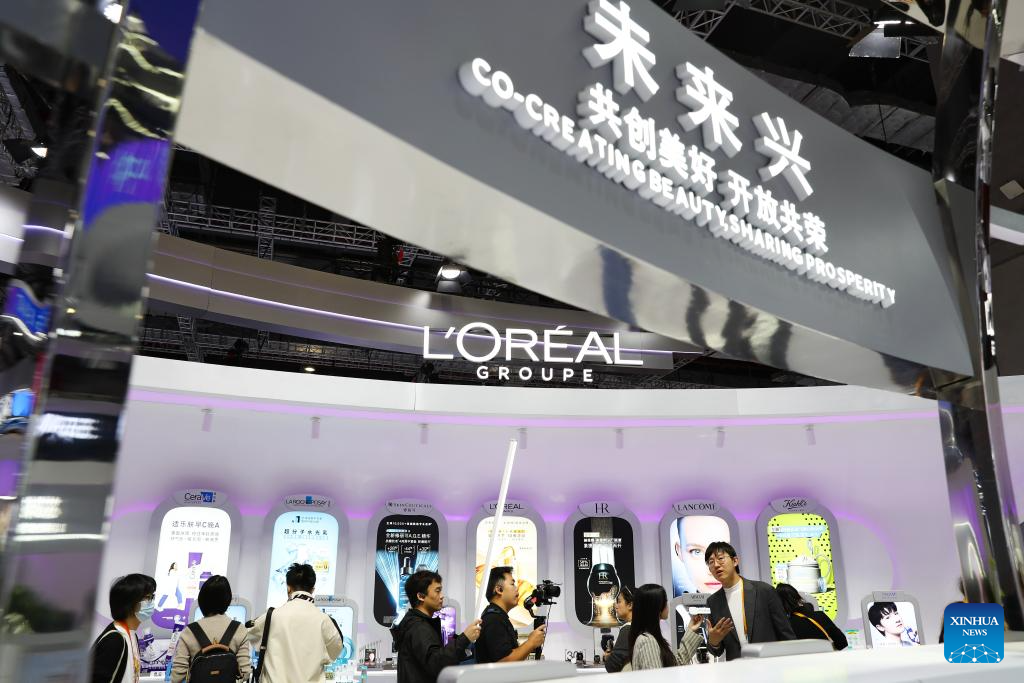 People visit the booth of L'Oreal, an eight-year attendee of the China International Import Expo (CIIE), during the eighth CIIE in east China's Shanghai, Nov. 7, 2025. The eighth CIIE, which opened in Shanghai on Wednesday and will last till Nov. 10, has attracted 4,108 overseas exhibitors from 155 countries, regions and international organizations.