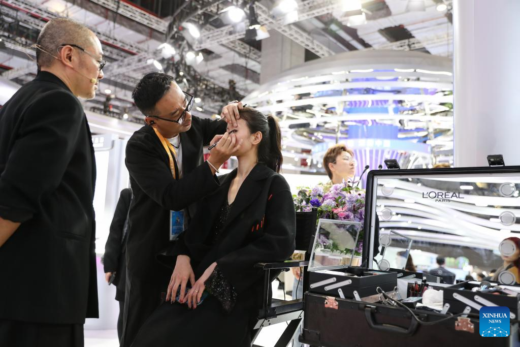 A visitor enjoys makeup service at the booth of L'Oreal, an eight-year attendee of the China International Import Expo (CIIE), during the eighth CIIE in east China's Shanghai, Nov. 7, 2025. The eighth CIIE, which opened in Shanghai on Wednesday and will last till Nov. 10, has attracted 4,108 overseas exhibitors from 155 countries, regions and international organizations.