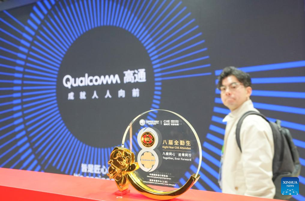 A man visits the booth of Qualcomm, an eight-year attendee of the China International Import Expo (CIIE), during the eighth CIIE in east China's Shanghai, Nov. 6, 2025. The eighth CIIE, which opened in Shanghai on Wednesday and will last till Nov. 10, has attracted 4,108 overseas exhibitors from 155 countries, regions and international organizations.