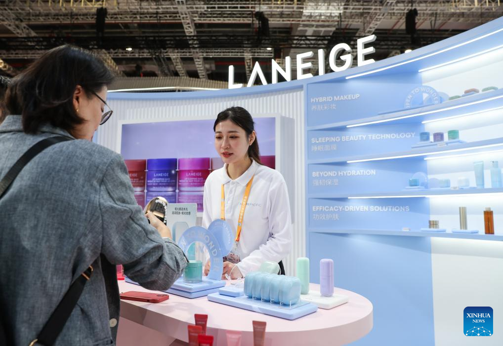 A staff member introduces the products of Laneige, a brand under Amorepacific Corporation, an eight-year attendee of the China International Import Expo (CIIE), during the eighth CIIE in east China's Shanghai, Nov. 7, 2025. The eighth CIIE, which opened in Shanghai on Wednesday and will last till Nov. 10, has attracted 4,108 overseas exhibitors from 155 countries, regions and international organizations.