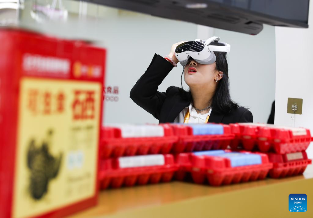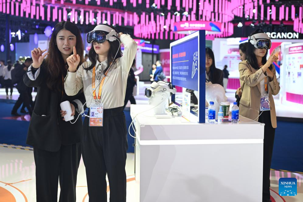 A woman tries a VR device at the booth of CP Group, an eight-year attendee of the China International Import Expo (CIIE), during the eighth CIIE in east China's Shanghai, Nov. 7, 2025. The eighth CIIE, which opened in Shanghai on Wednesday and will last till Nov. 10, has attracted 4,108 overseas exhibitors from 155 countries, regions and international organizations.