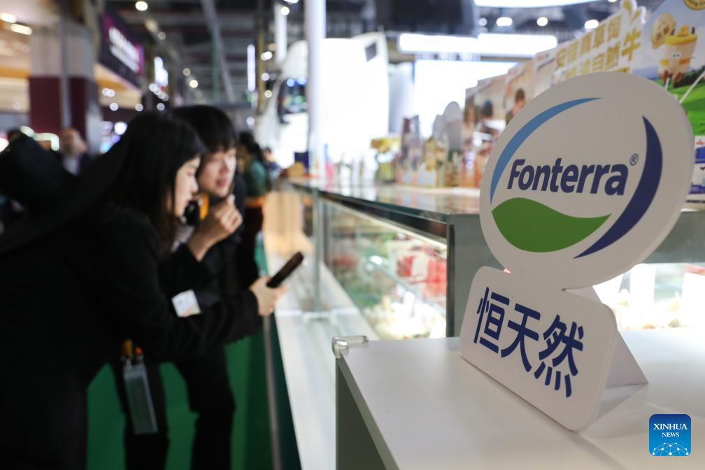 People visit the booth of Fonterra, an eight-year attendee of the China International Import Expo (CIIE), during the eighth CIIE in east China's Shanghai, Nov. 7, 2025. The eighth CIIE, which opened in Shanghai on Wednesday and will last till Nov. 10, has attracted 4,108 overseas exhibitors from 155 countries, regions and international organizations.