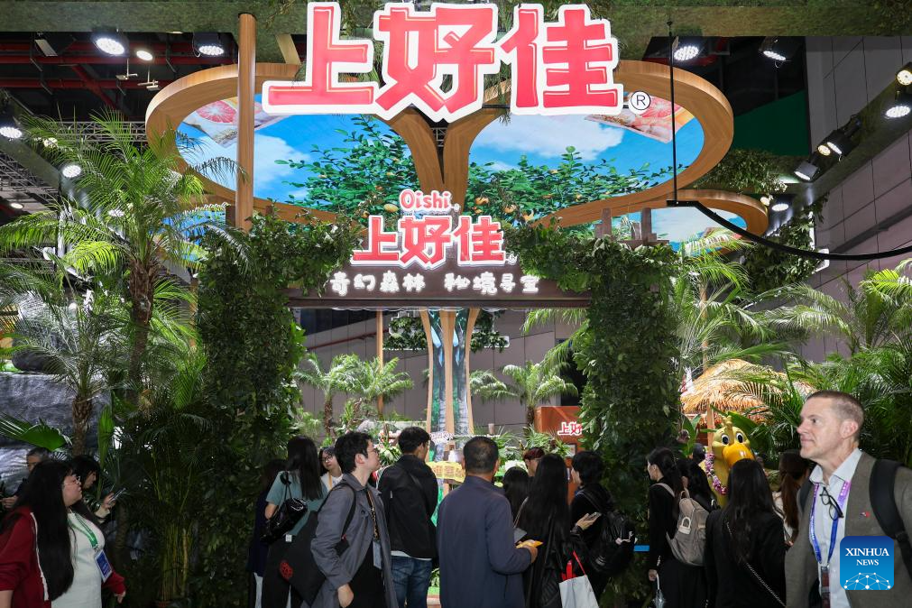 People visit the booth of Oishi, an eight-year attendee of the China International Import Expo (CIIE), during the eighth CIIE in east China's Shanghai, Nov. 7, 2025. The eighth CIIE, which opened in Shanghai on Wednesday and will last till Nov. 10, has attracted 4,108 overseas exhibitors from 155 countries, regions and international organizations.