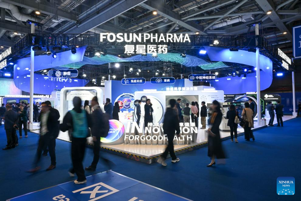 People visit the booth of Fosun Pharma, an eight-year attendee of the China International Import Expo (CIIE), during the eighth CIIE in east China's Shanghai, Nov. 7, 2025. The eighth CIIE, which opened in Shanghai on Wednesday and will last till Nov. 10, has attracted 4,108 overseas exhibitors from 155 countries, regions and international organizations.