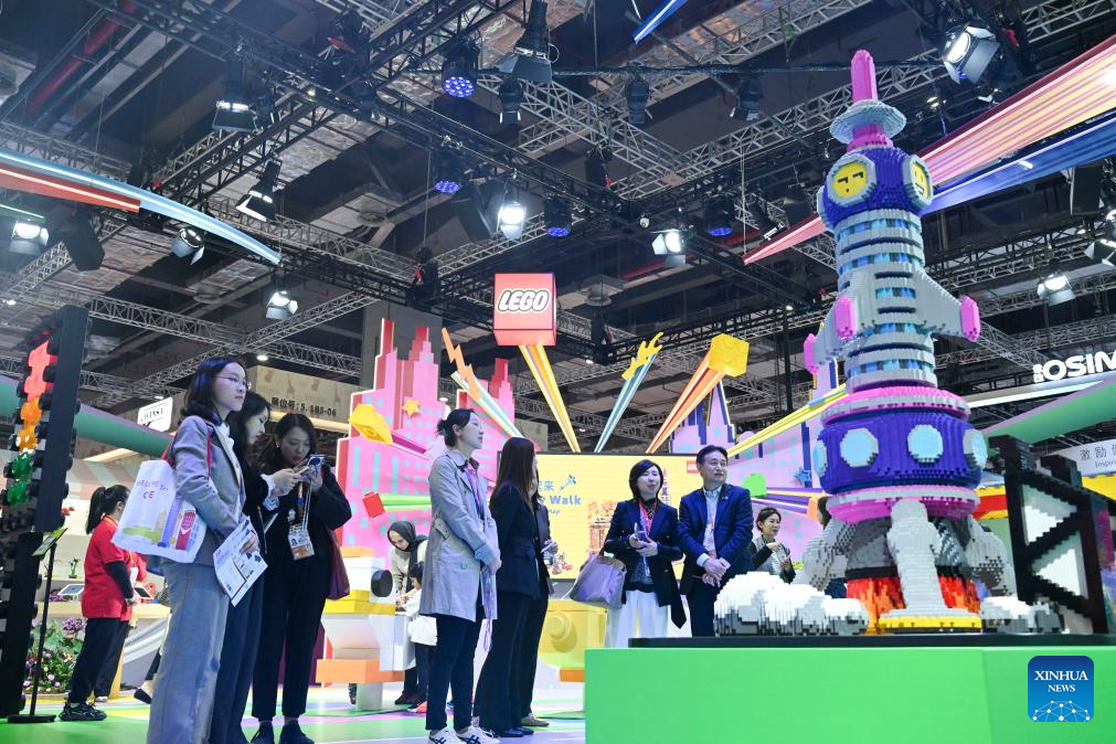 People visit the booth of Lego, an eight-year attendee of the China International Import Expo (CIIE), during the eighth CIIE in east China's Shanghai, Nov. 7, 2025. The eighth CIIE, which opened in Shanghai on Wednesday and will last till Nov. 10, has attracted 4,108 overseas exhibitors from 155 countries, regions and international organizations.