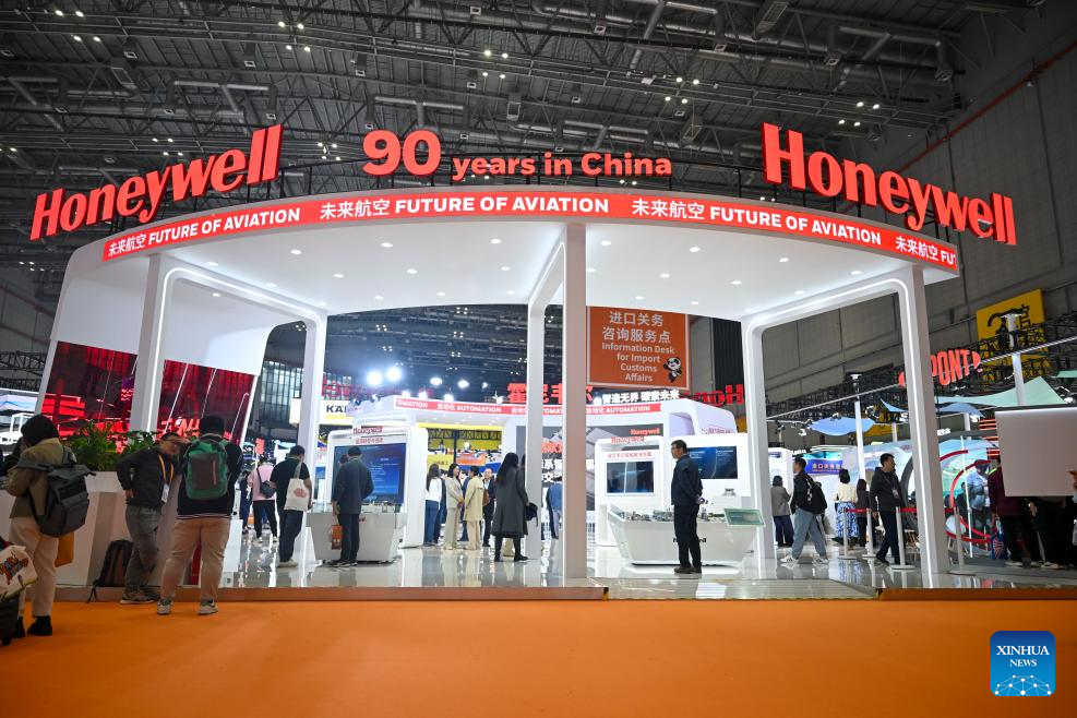 People visit the booth of Honeywell, an eight-year attendee of the China International Import Expo (CIIE), during the eighth CIIE in east China's Shanghai, Nov. 7, 2025. The eighth CIIE, which opened in Shanghai on Wednesday and will last till Nov. 10, has attracted 4,108 overseas exhibitors from 155 countries, regions and international organizations.