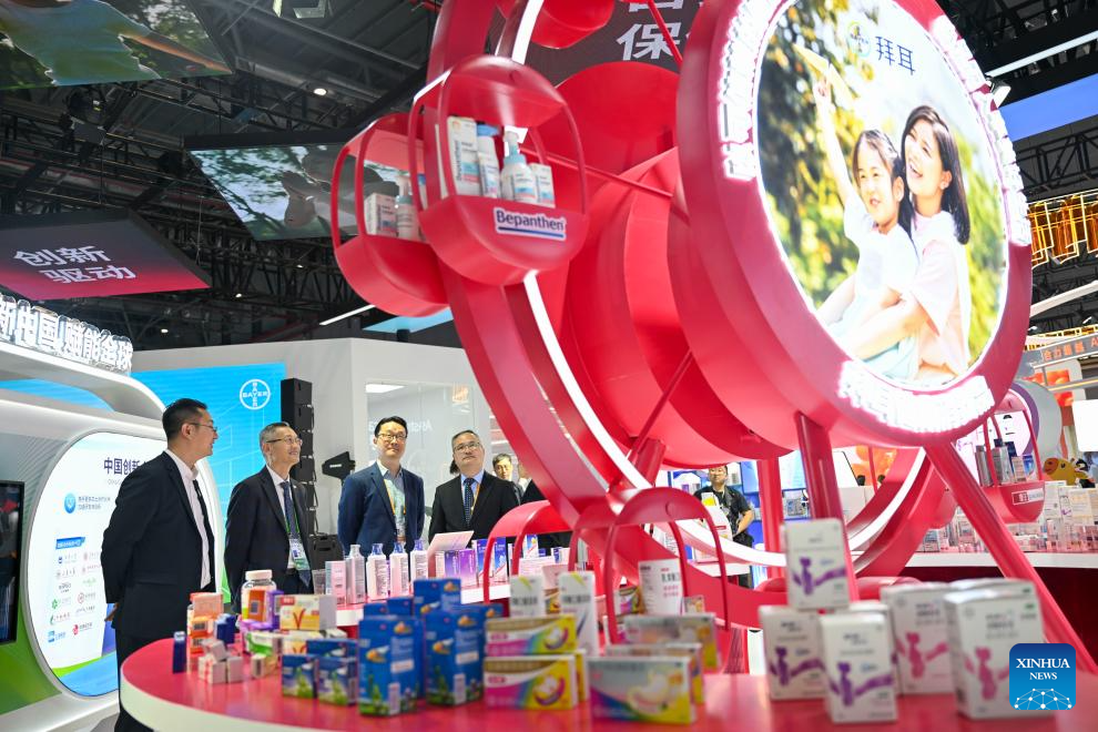 People visit the booth of Bayer, an eight-year attendee of the China International Import Expo (CIIE), during the eighth CIIE in east China's Shanghai, Nov. 7, 2025. The eighth CIIE, which opened in Shanghai on Wednesday and will last till Nov. 10, has attracted 4,108 overseas exhibitors from 155 countries, regions and international organizations.