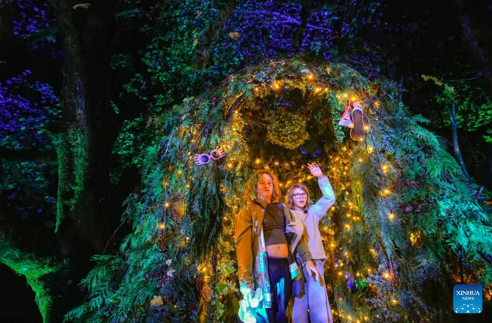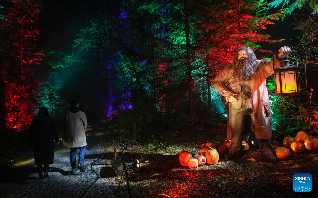 People walk along an illuminated woodland trail during a media preview of the "Harry Potter: A Forbidden Forest Experience" at Stanley Park in Vancouver, British Columbia, Canada, Nov. 6, 2025. The immersive outdoor event allows visitors to explore a themed trail inspired by the Forbidden Forest from the Harry Potter films. Through virtual reality effects and lighting installations, the woodland is transformed into a magical pathway featuring mystical creatures, interactive displays, and a themed village. The event made its Canadian debut in Vancouver on Nov. 7 and run until Dec. 7. (Photo by Liang Sen/Xinhua)