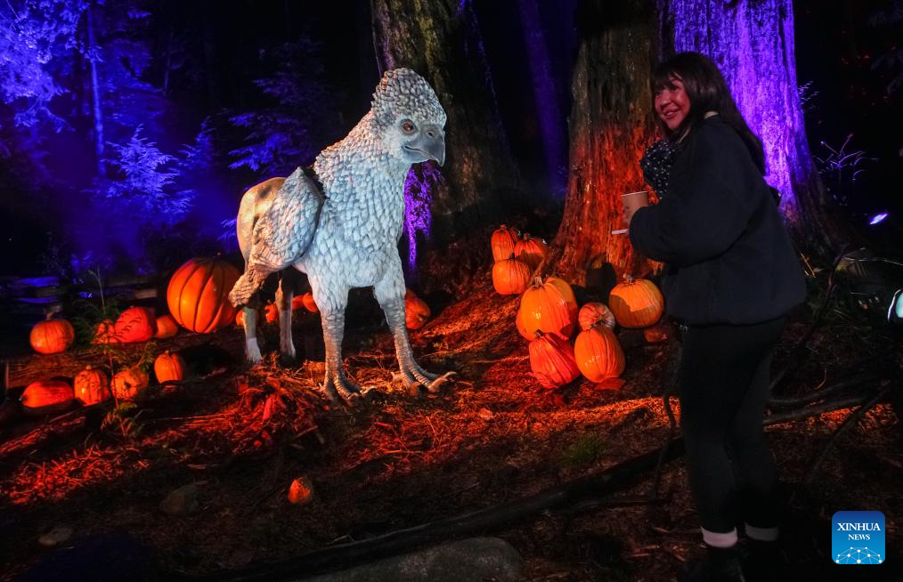 A girl poses for a photo in front of an installation during a media preview of the "Harry Potter: A Forbidden Forest Experience" at Stanley Park in Vancouver, British Columbia, Canada, Nov. 6, 2025. The immersive outdoor event allows visitors to explore a themed trail inspired by the Forbidden Forest from the Harry Potter films. Through virtual reality effects and lighting installations, the woodland is transformed into a magical pathway featuring mystical creatures, interactive displays, and a themed village. The event made its Canadian debut in Vancouver on Nov. 7 and run until Dec. 7. (Photo by Liang Sen/Xinhua)