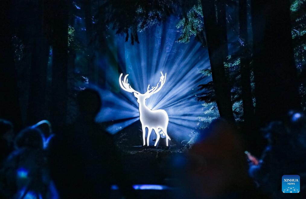 People view a light show during a media preview of the "Harry Potter: A Forbidden Forest Experience" at Stanley Park in Vancouver, British Columbia, Canada, Nov. 6, 2025. The immersive outdoor event allows visitors to explore a themed trail inspired by the Forbidden Forest from the Harry Potter films. Through virtual reality effects and lighting installations, the woodland is transformed into a magical pathway featuring mystical creatures, interactive displays, and a themed village. The event made its Canadian debut in Vancouver on Nov. 7 and run until Dec. 7. (Photo by Liang Sen/Xinhua)