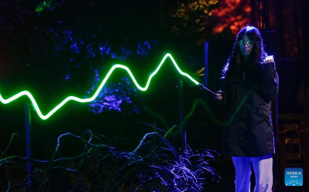 A teenager plays with an interactive installation during a media preview of the "Harry Potter: A Forbidden Forest Experience" at Stanley Park in Vancouver, British Columbia, Canada, Nov. 6, 2025. The immersive outdoor event allows visitors to explore a themed trail inspired by the Forbidden Forest from the Harry Potter films. Through virtual reality effects and lighting installations, the woodland is transformed into a magical pathway featuring mystical creatures, interactive displays, and a themed village. The event made its Canadian debut in Vancouver on Nov. 7 and run until Dec. 7. (Photo by Liang Sen/Xinhua)