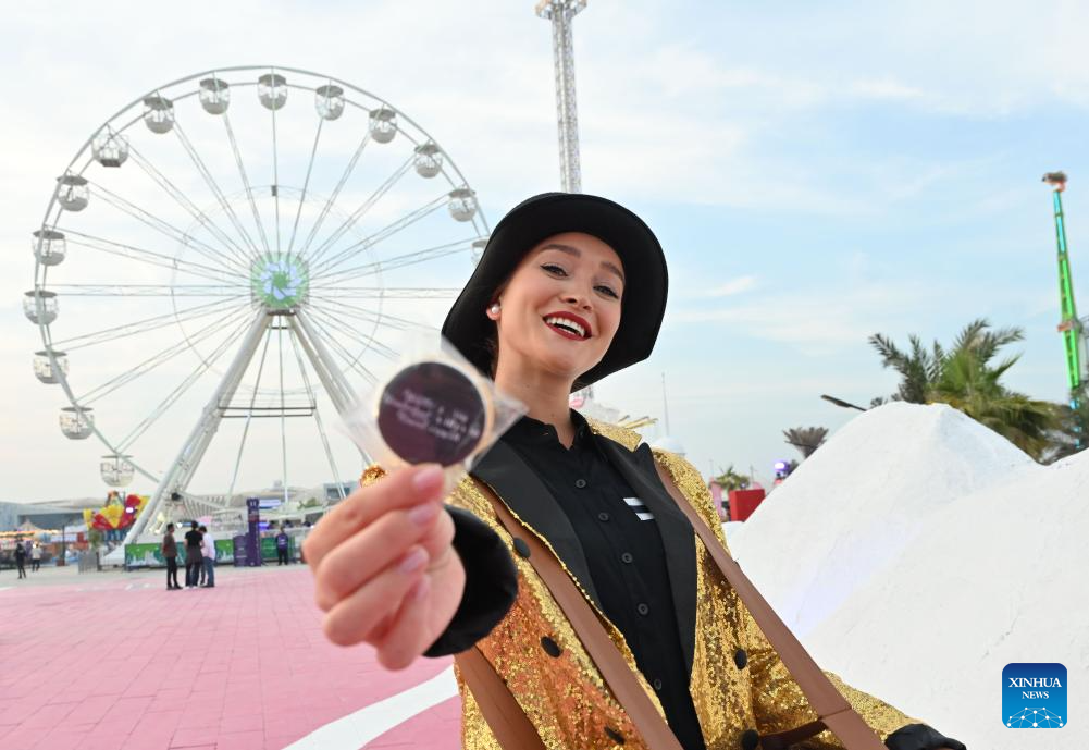 A performer welcomes visitors at "Winter Wonderland Kuwait" in Hawalli Governorate, Kuwait, Nov. 6, 2025. "Winter Wonderland Kuwait", one of the largest entertainment projects in the country, opened its fourth season here on Thursday. (Photo by Asad/Xinhua)