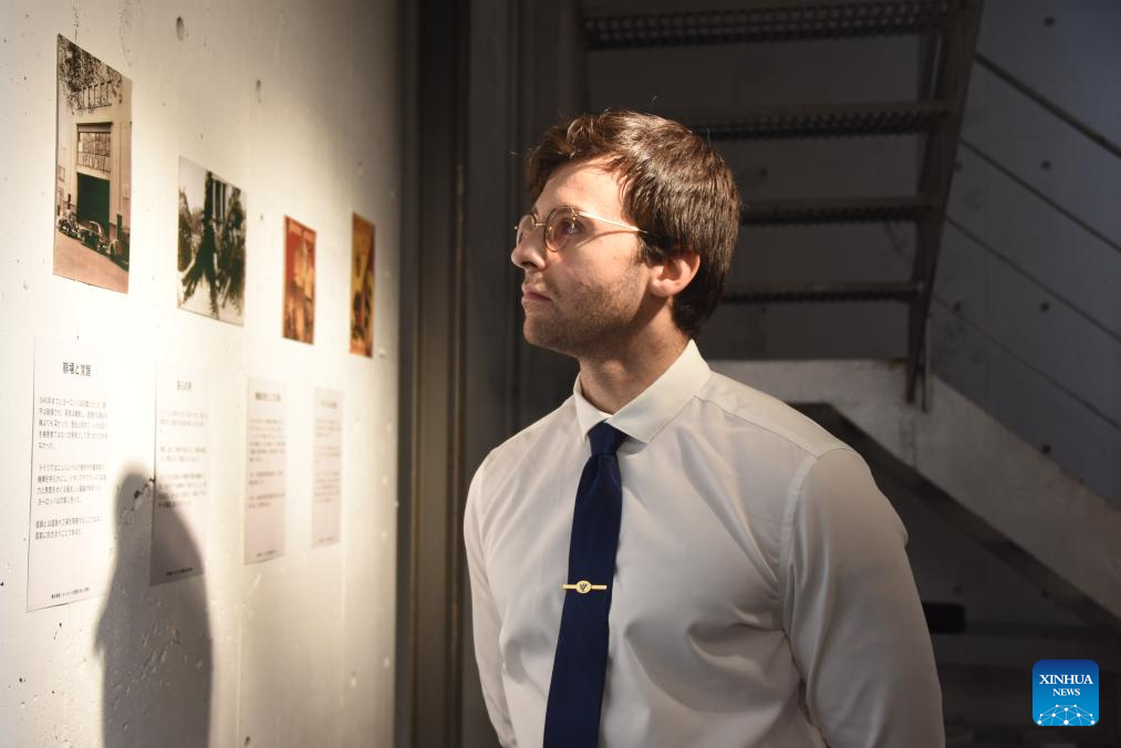 Marcus Detrez looks at the photos during the photo exhibition in Tokyo, Japan, on Oct. 29, 2025. Young Frenchman Marcus Detrez recently held a photo exhibition in Tokyo, showcasing dozens of photocopies and some originals of historical photographs documenting the atrocities committed by the Japanese imperial army during its invasion of China, such as bombing Shanghai and massacring civilians. (Xinhua/Hu Xiaoge)