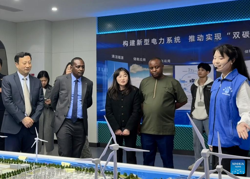 Paul Umukunzi (2nd L, front), director general of the Rwanda TVET Board, and staff members visit Zhengzhou Electric Power College in Zhengzhou, central China's Henan Province, Nov. 4, 2025. (Xinhua)