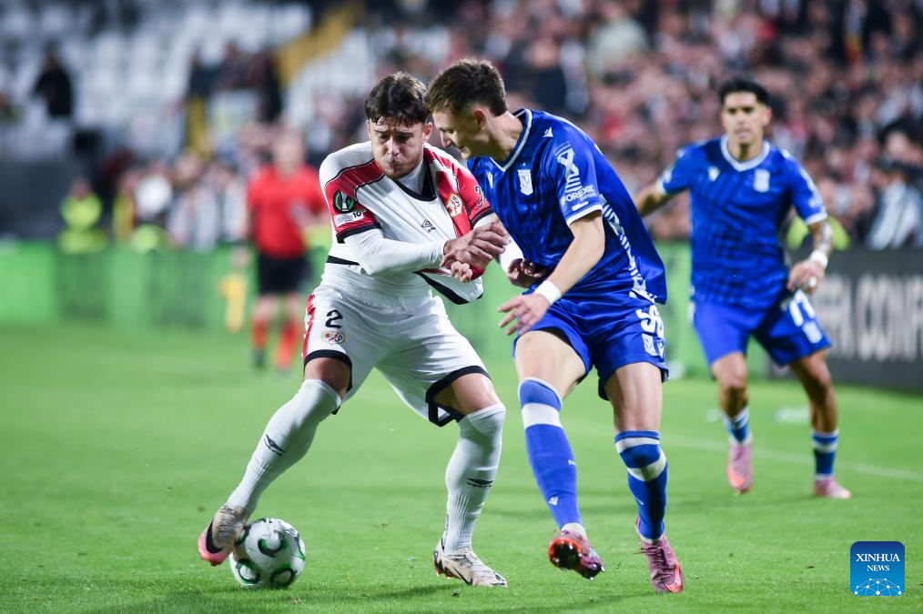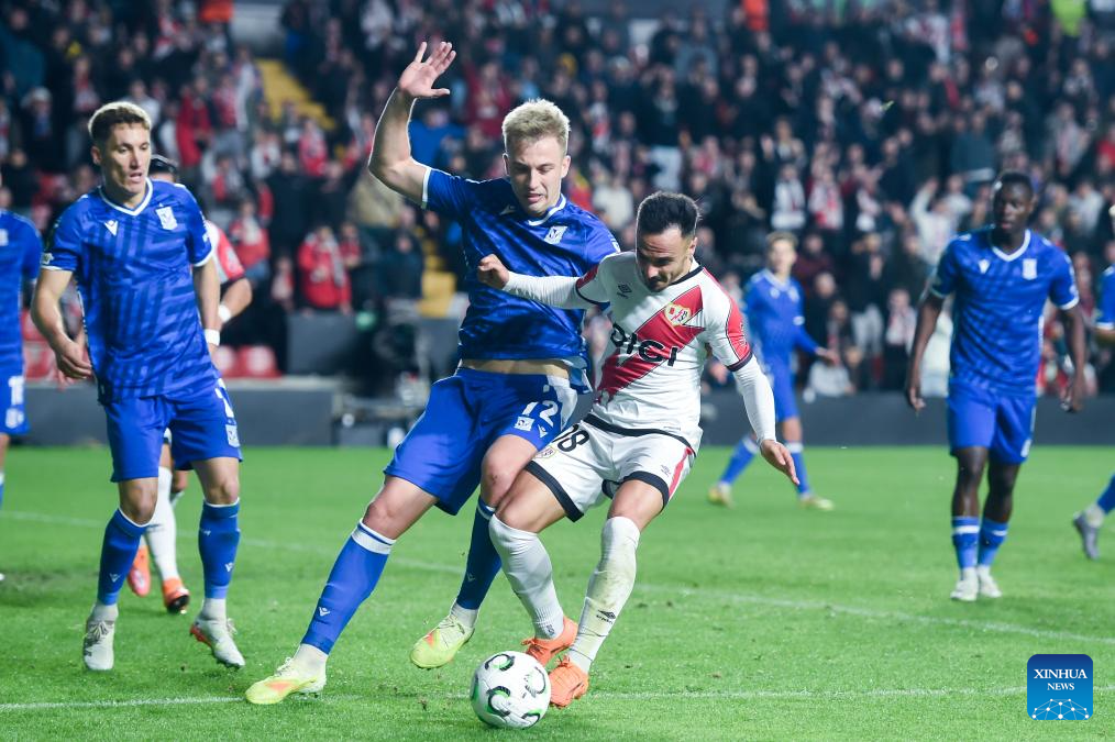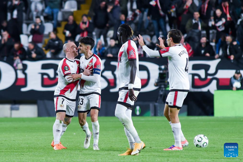 Players of Rayo Vallecano celebrate a goal during the round 3 match between Rayo Vallecano and Lech Poznan at the 2025-2026 UEFA Europa Conference League in Madrid, Spain, Nov. 6, 2025. (Photo by Gustavo Valiente/Xinhua)