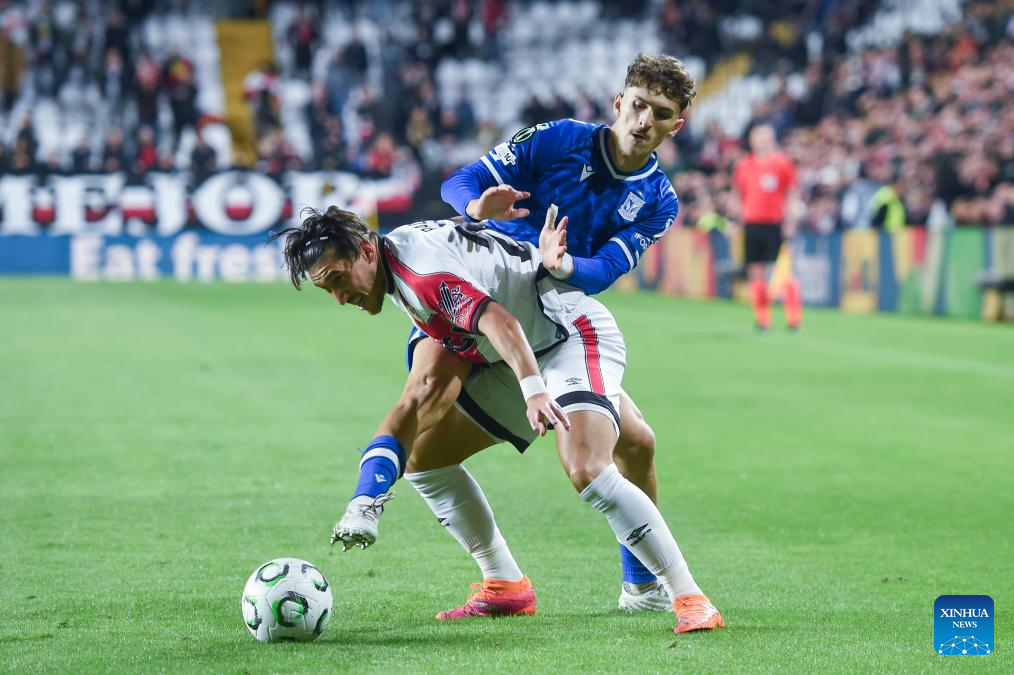 Alfonso Espino (R) of Rayo Vallecano vies with Joel Pereira of Lech Poznan during the round 3 match between Rayo Vallecano and Lech Poznan at the 2025-2026 UEFA Europa Conference League in Madrid, Spain, Nov. 6, 2025. (Photo by Gustavo Valiente/Xinhua)