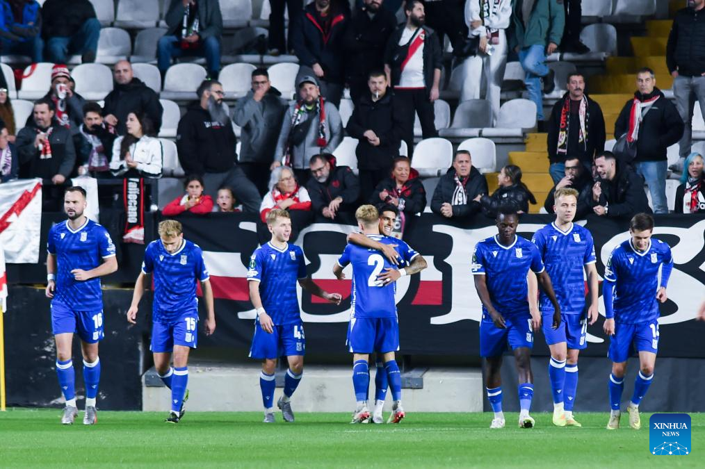 Players of Lech Poznan celebrate a goal during the round 3 match between Rayo Vallecano and Lech Poznan at the 2025-2026 UEFA Europa Conference League in Madrid, Spain, Nov. 6, 2025. (Photo by Gustavo Valiente/Xinhua)