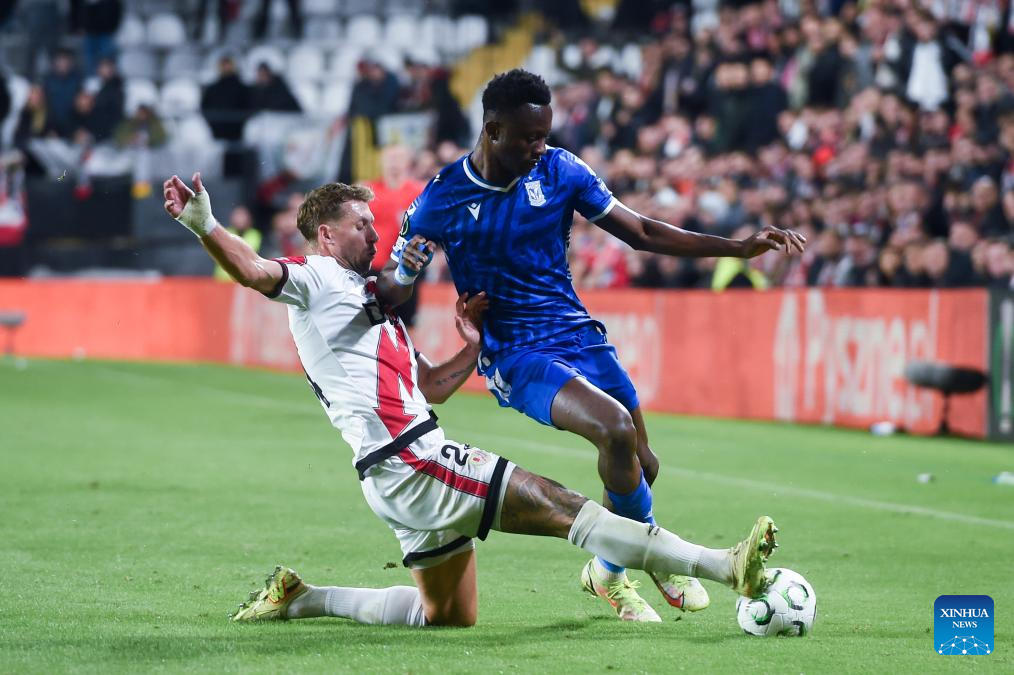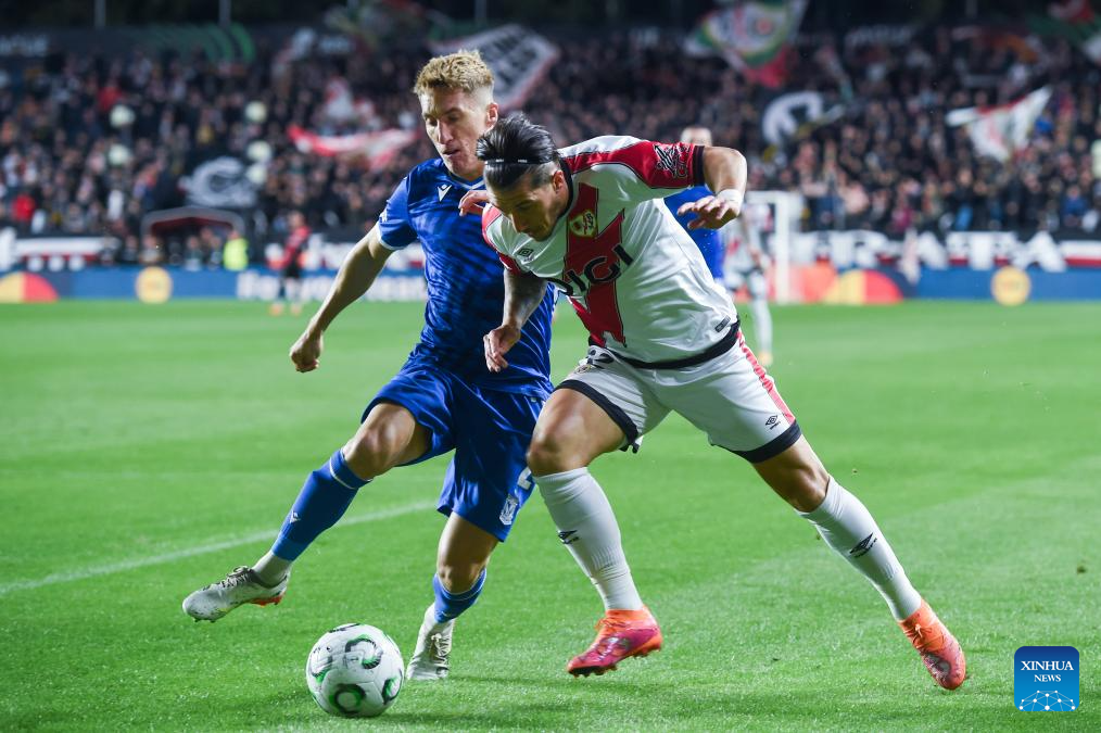 Andrei Ratiu (front L) of Rayo Vallecano vies with Kornel Lisman (front R) of Lech Poznan during the round 3 match between Rayo Vallecano and Lech Poznan at the 2025-2026 UEFA Europa Conference League in Madrid, Spain, Nov. 6, 2025. (Photo by Gustavo Valiente/Xinhua)