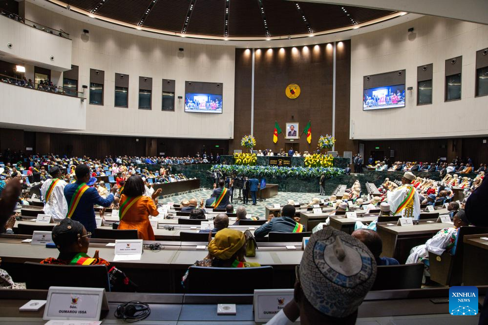 Cameroonian President Paul Biya (C) is sworn in Yaounde, capital of Cameroon, Nov. 6, 2025. Cameroonian President Paul Biya was sworn in on Thursday for a new seven-year term after winning 53.66 percent of the vote in the country's Oct. 12 presidential election. (Xinhua/Kepseu)