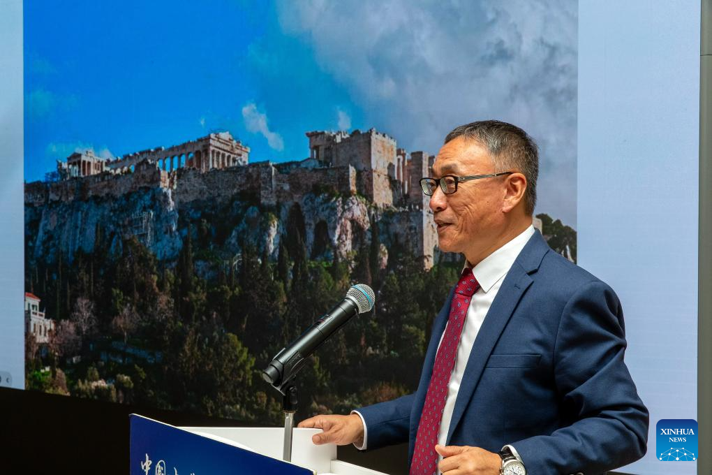 Chinese School of Classical Studies Director Li Xinwei gives speech at the Chinese School of Classical Studies (CSCSA) in Athens, Greece on Nov. 7, 2025. The Chinese School of Classical Studies (CSCSA) held a series of academic seminars and activities in Athens on Friday to mark its first anniversary, with scholars from China and Greece having exchanges on archaeological research and academic cooperation. (Photo by Marios Lolos/Xinhua)