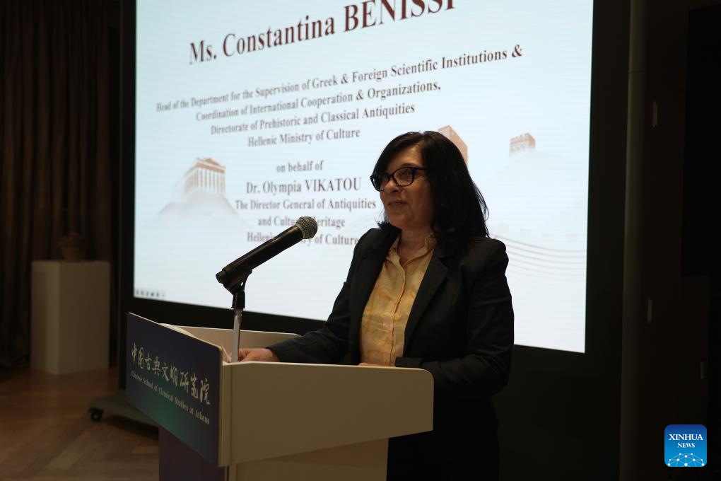 Constantina Benissi, a representative from the Greek Ministry of Culture gives speech at the Chinese School of Classical Studies (CSCSA) in Athens, Greece on Nov. 7, 2025. The Chinese School of Classical Studies (CSCSA) held a series of academic seminars and activities in Athens on Friday to mark its first anniversary, with scholars from China and Greece having exchanges on archaeological research and academic cooperation. (Photo by Marios Lolos/Xinhua)
