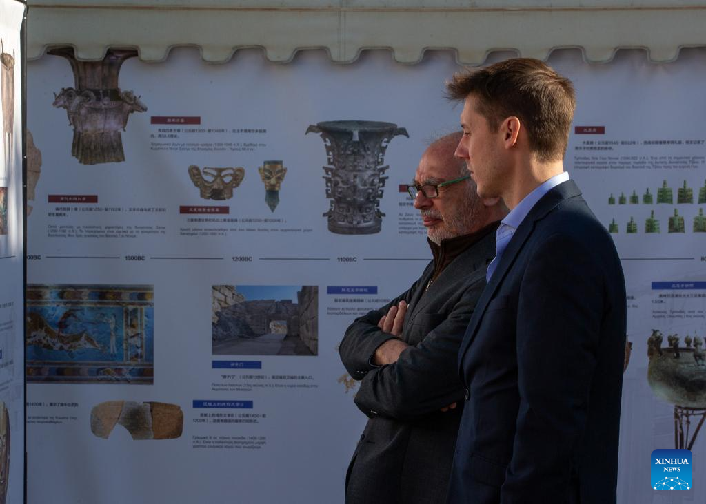 Scholars visit a photo exhibition at the Chinese School of Classical Studies (CSCSA) in Athens, Greece on Nov. 7, 2025. The Chinese School of Classical Studies (CSCSA) held a series of academic seminars and activities in Athens on Friday to mark its first anniversary, with scholars from China and Greece having exchanges on archaeological research and academic cooperation. (Photo by Marios Lolos/Xinhua)