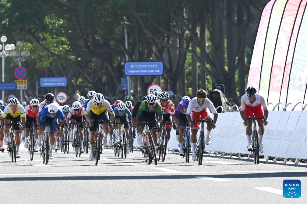 Cyclists cross the finish line during the men's road race of cycling road at China's 15th National Games in south China's Guangdong Province, Nov. 8, 2025. (Xinhua/Lian Zhen)