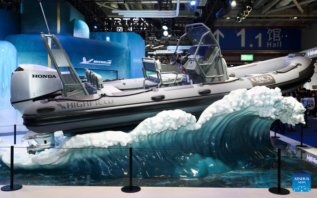 A composite-coated rigid inflatable boat is seen at the booth of Michelin at the Automobile and Smart Mobility exhibition area of the eighth China International Import Expo (CIIE) in east China's Shanghai, Nov. 8, 2025. The eighth CIIE showcased a range of new mobility products and innovative technologies, unfolding a diversified and multi-dimensional vision of future transportation. (Xinhua/Wang Xiang)