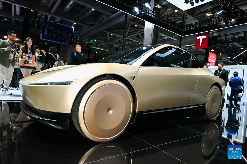 A Tesla Cybercab is seen at the booth of Tesla at the Automobile and Smart Mobility exhibition area of the eighth China International Import Expo (CIIE) in east China's Shanghai, Nov. 8, 2025. The eighth CIIE showcased a range of new mobility products and innovative technologies, unfolding a diversified and multi-dimensional vision of future transportation. (Xinhua/Cai Xiangxin)
