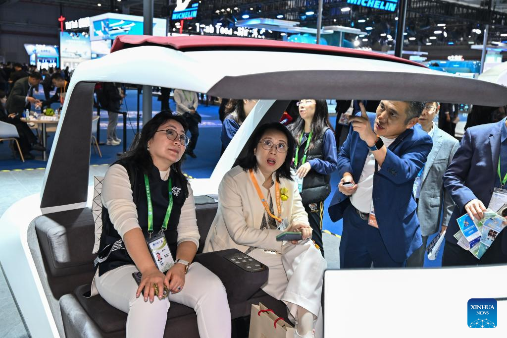 Visitors learn about a smart cockpit at the booth of Webasto at the Automobile and Smart Mobility exhibition area of the eighth China International Import Expo (CIIE) in east China's Shanghai, Nov. 8, 2025. The eighth CIIE showcased a range of new mobility products and innovative technologies, unfolding a diversified and multi-dimensional vision of future transportation. (Xinhua/Cai Xiangxin)