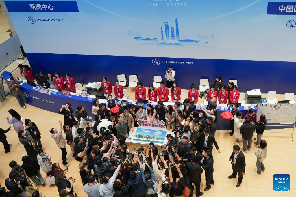 A giant cake marking the Journalists' Day is pictured at the media center for the 8th China International Import Expo (CIIE) in Shanghai, east China, Nov. 8, 2025. The media center for the 8th CIIE held various events on Saturday to mark China's annual Journalists' Day, which falls on Nov. 8. (Xinhua/Zhang Ziyu)