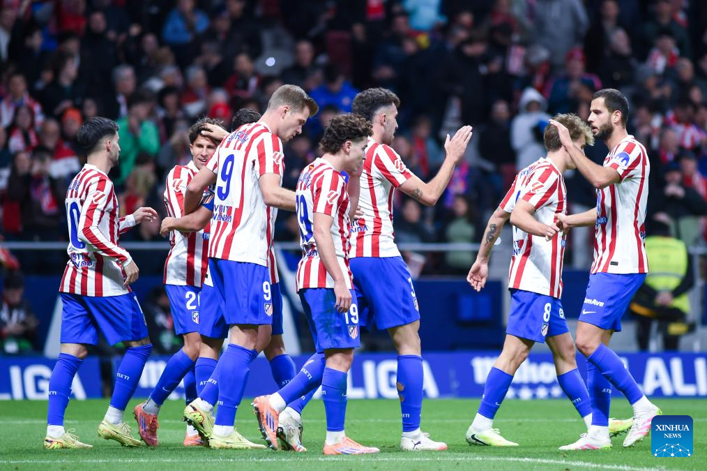 Players of Atletico de Madrid celebrate a goal during the La Liga football match between Atletico de Madrid and Levante UD in Madrid, Spain, Nov. 8, 2025. (Photo by Gustavo Valiente/Xinhua)