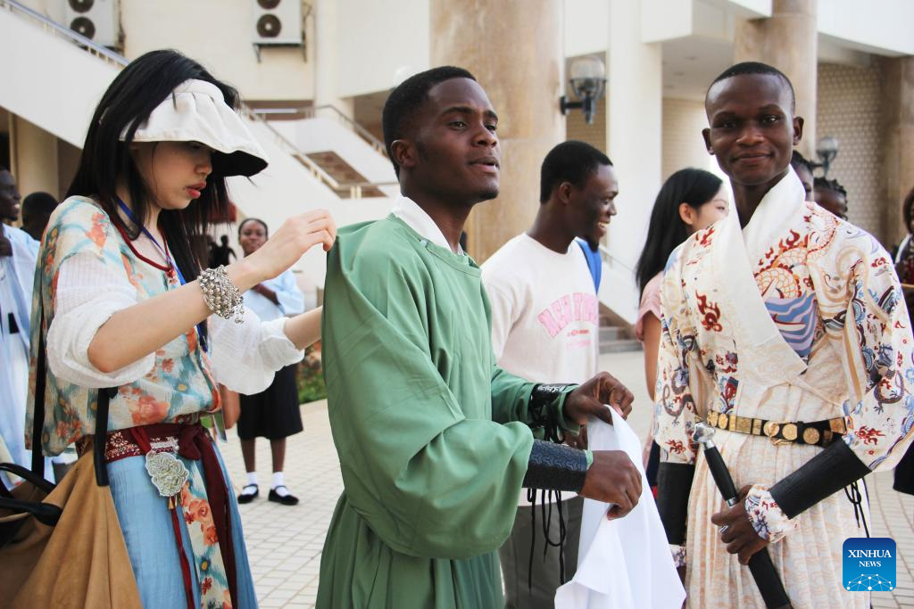 Students from the Confucius Institute of the University of Abomey-Calavi present traditional Chinese attires during the China-Benin Fashion Show at the central square of the Palais des Congres in Cotonou, Benin, Nov. 8, 2025. (Photo by Seraphin Zounyekpe/Xinhua)