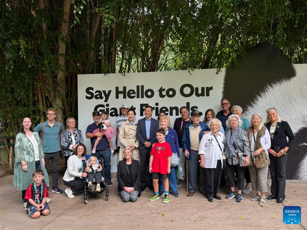 Chinese Consul General in Los Angeles Guo Shaochun poses for a group photo with a veteran and other family members of the Flying Tigers during a special meet and greet with the giant pandas Yun Chuan and Xin Bao at the San Diego Zoo in San Diego, California, the United States, Nov. 8, 2025. (Xinhua/Tan Jingjing)