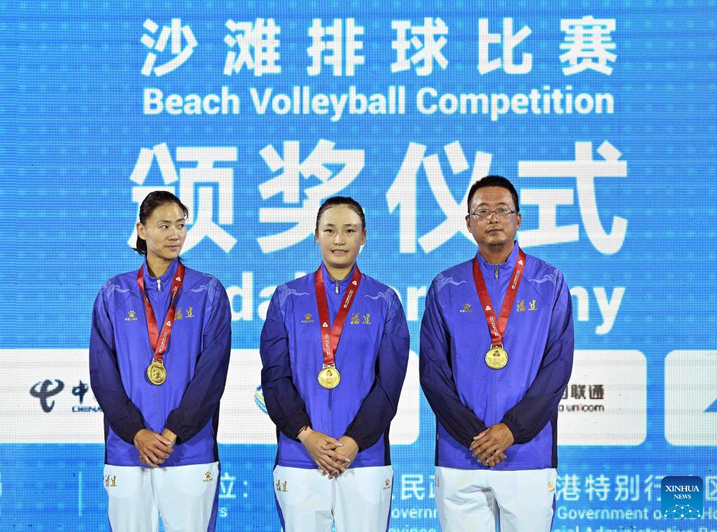 Xue Chen/Zeng Jinjin of Fujian pose for photos with their coach during the awarding ceremony for the women's Beach Volleyball at China's 15th National Games in Hong Kong, south China, Nov. 8, 2025. (Xinhua/Chen Duo)