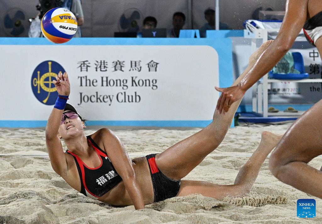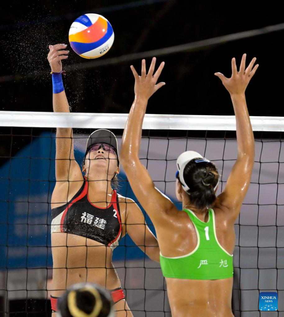 Xue Chen (R) and Zeng Jinjin of Fujian compete during the Beach Volleyball women's final between Xue Chen/Zeng Jinjin of Fujian and Yan Xu/Zhou Mingli of Nanjing Sport Institute at China's 15th National Games in Hong Kong, south China, Nov. 8, 2025. (Xinhua/Lo Ping Fai)