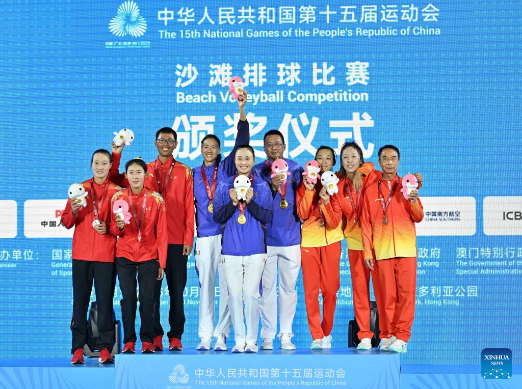 Gold medalists Xue Chen/Zeng Jinjin of Fujian, silver medalists Yan Xu/Zhou Mingli of Nanjing Sport Institute, bronze medalists Wang Jingzhe/Xia Xinyi of Xinjiang pose for photos with their coaches during the awarding ceremony for the women's Beach Volleyball at China's 15th National Games in Hong Kong, south China, Nov. 8, 2025. (Xinhua/Chen Duo)