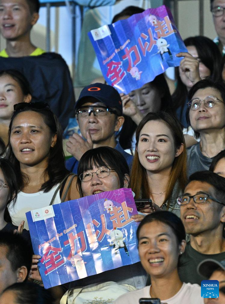 Spectators cheer for athletes during the Beach Volleyball women's final between Xue Chen/Zeng Jinjin of Fujian and Yan Xu/Zhou Mingli of Nanjing Sport Institute at China's 15th National Games in Hong Kong, south China, Nov. 8, 2025. (Xinhua/Chen Duo)