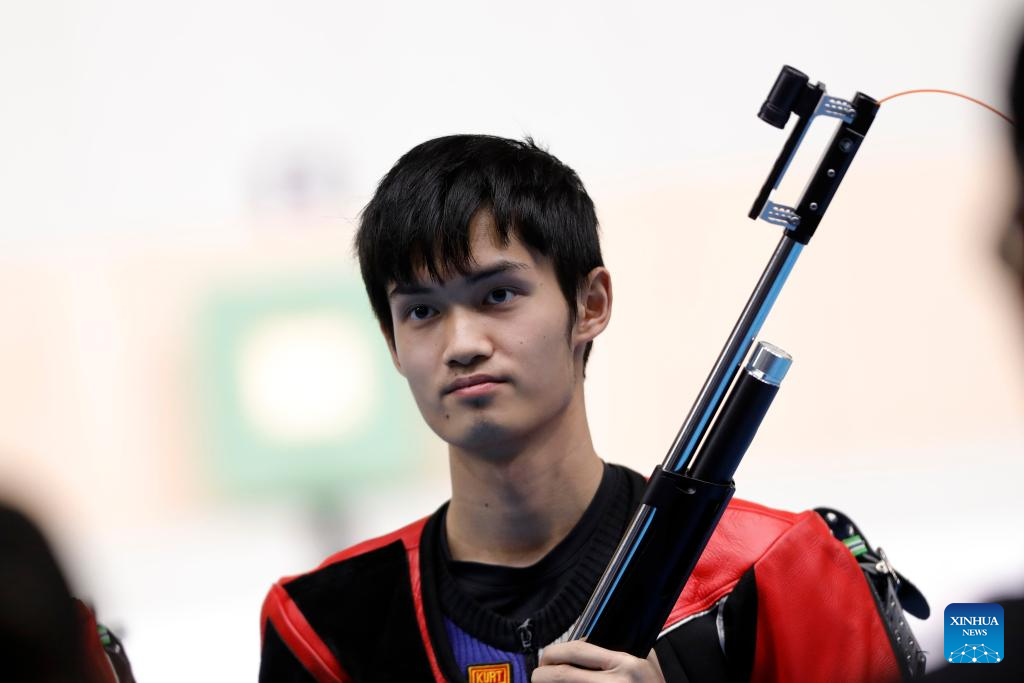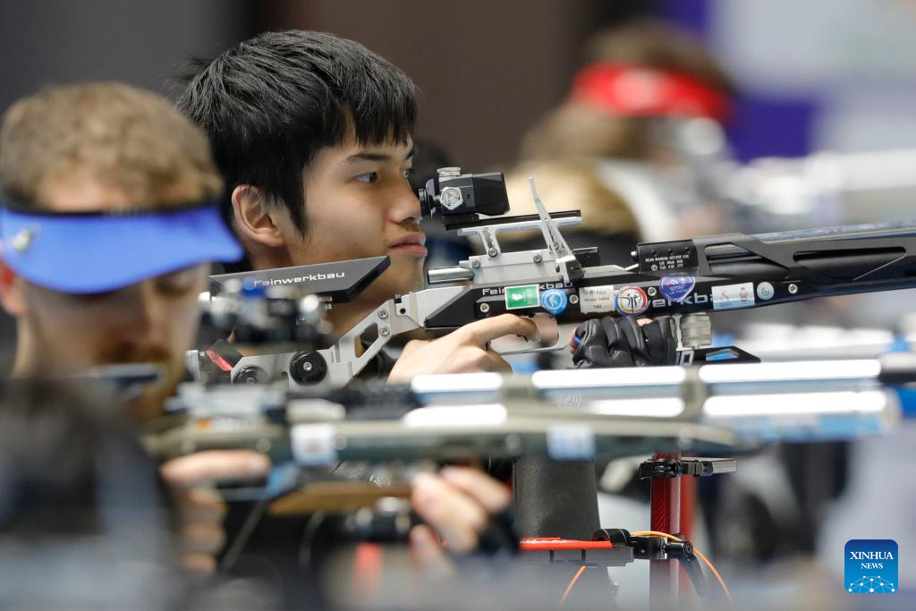 Sheng Lihao of China competes during the 10m air rifle men's final of shooting at the 2025 ISSF World Championship Rifle/Pistol in Cairo, Egypt, on Nov. 8, 2025. (Xinhua/Sui Xiankai)
