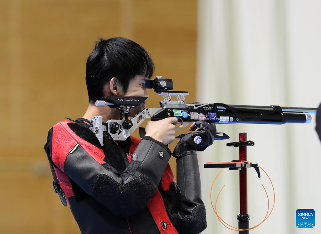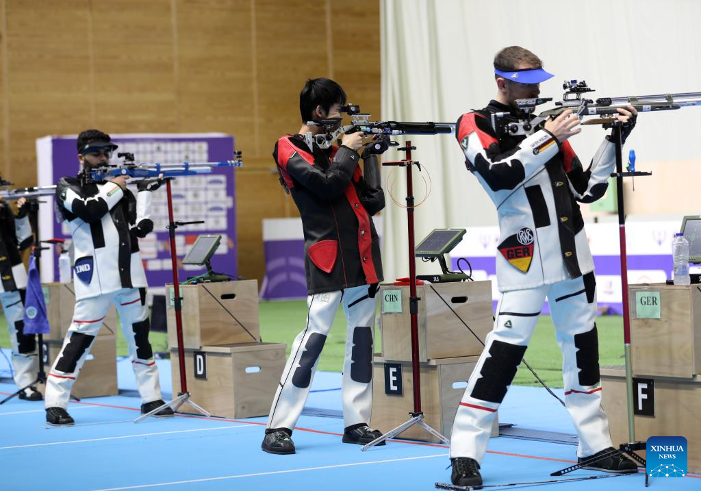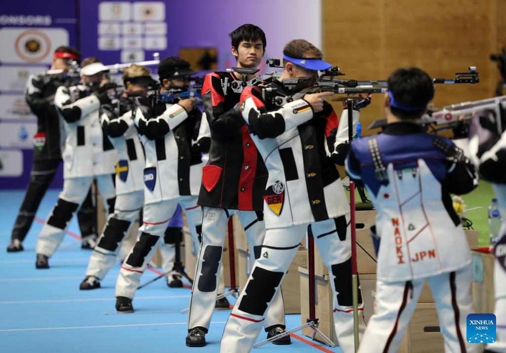 Sheng Lihao (C) of China competes during the 10m air rifle men's final of shooting at the 2025 ISSF World Championship Rifle/Pistol in Cairo, Egypt, on Nov. 8, 2025. (Xinhua/Sui Xiankai)